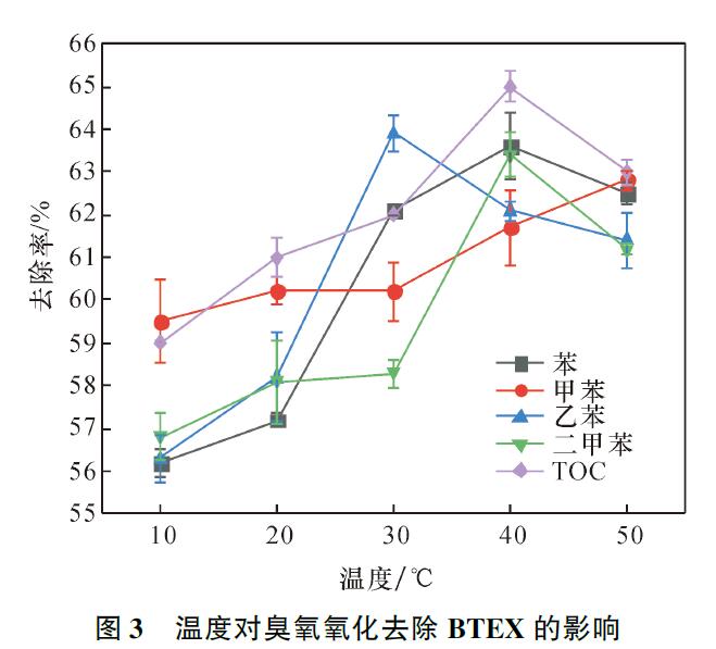 本實(shí)驗(yàn)的主要目標(biāo)是尋找臭氧降解BTEX的 很佳反應(yīng)溫度。實(shí)驗(yàn)設(shè)定5個(gè)溫度變量,分別為10℃、20℃、30℃、40℃、50℃。實(shí)驗(yàn)中目標(biāo)有機(jī)物的去除效率以TOC的濃度變化來評定。溫度對臭氧氧化去除BTEX的影響如圖3所示。