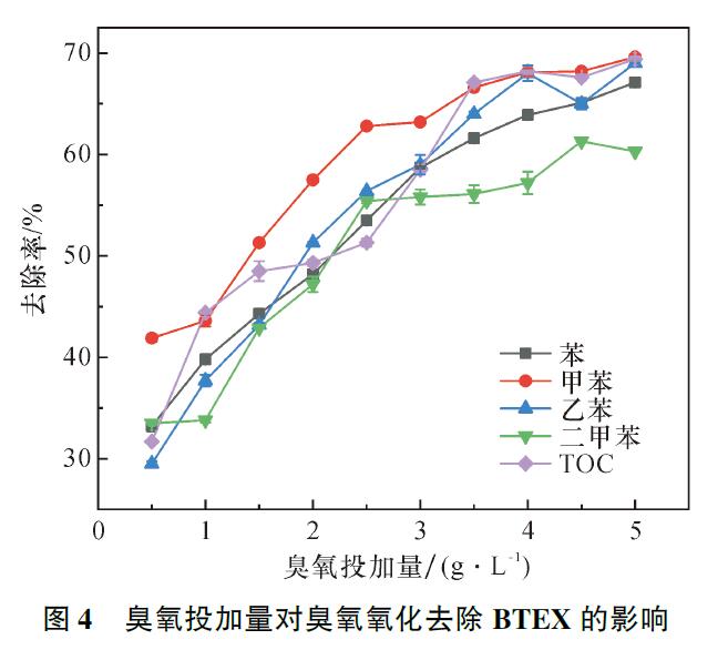 臭氧的通氣量直接影響目標(biāo)有機(jī)污染物的降解效果和實(shí)際處理過程中的工藝成本。根據(jù)前人的研究成果可知,臭氧濃度越高則有機(jī)物去除率越大。但在實(shí)際處理過程中,考慮運(yùn)行成本等因素,不能一味增加臭氧投加量來提高反應(yīng)效率。因此,本研究主要探索臭氧投加量對BTEX去除的影響(圖4)。