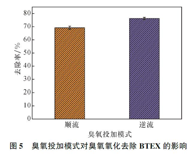 從圖5可以看出,當(dāng)昊氧的投加模式為順流時(shí),BTEX的去除效率為69.2%;當(dāng)臭氧的投加模式為逆流時(shí),其降解效率為76.3%,增加了7.1%。
