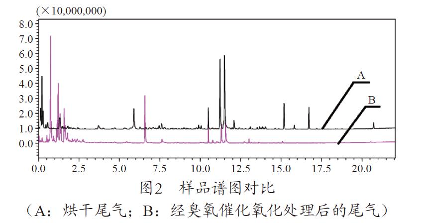 如圖1 所示,干燥/ 烘干工藝尾氣,經(jīng)過堿噴淋(預(yù)處理),進(jìn)入內(nèi)部裝填催化填料的催化氧化塔。臭氧同時(shí)通入氧化塔,發(fā)生多相催化氧化,大部分有機(jī)污染物會(huì)被氧化分解,少數(shù)沒有完全氧化的有機(jī)物再經(jīng)過后處理, 很終達(dá)標(biāo)排放。