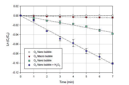 我們可以通過產(chǎn)生納米氣泡來增加氣泡的總表面積。較大的表面積意味著臭氧氣體從氣體轉(zhuǎn)移到水中的可能性更大。因此,我們比較了大臭氧和納米臭氧的臭氧傳質(zhì)(圖1)。從0到7分鐘,納米臭氧氣體向水中的傳輸速率(1.67 mg / L / min)比大型臭氧(0.17 mg / L / min)快9.8倍。由于其在水溶液中的耐久性,納米臭氧濃度的半衰期比大臭氧的半衰期高23倍。使用納米氣泡時(shí),臭氧濃度的半衰期更長,可以用氣泡排斥理論來解釋。納米臭氧可以增強(qiáng)臭氧在水相中的耐久性。由于OH離子的選擇性吸附,納米氣泡在各種pH值下都帶有負(fù)電荷。由于H +(-1127 kJ / mol)的水合焓比OH-(-489 kJ / mol)的水合焓低得多,因此納米氣泡的帶電表面會產(chǎn)生排斥力。這種現(xiàn)象有助于避免氣泡合并。