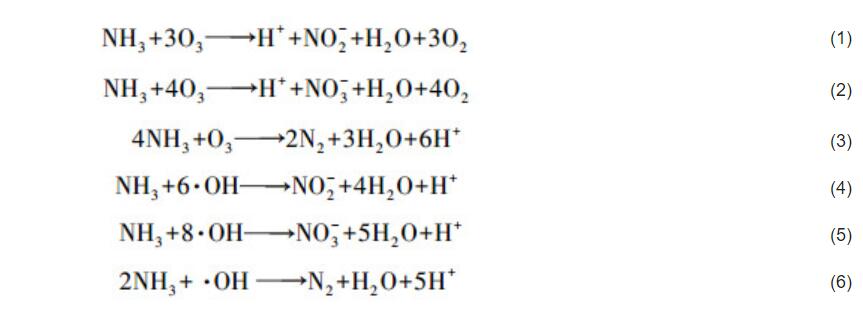 化學(xué)氧化法是一種重要的低溫除氨方法, 臭氧氧化法是其中之一.臭氧作為一種相對安全的消毒劑和氧化劑已被廣泛用于水處理中, 其對氨氮有一定的氧化能力(Singer et al., 1975), 且低溫時(shí)臭氧的溶解性和有效利用率較高, 因此, 臭氧氧化除氨有可能成為低溫化學(xué)除氨的一種有效途徑.O3及其產(chǎn)生的·OH與氨氮的反應(yīng)方程式分別如式(1)~(2)(Singer et al., 1975)和式(3)~(6)(Chen et al., 2018)所示.