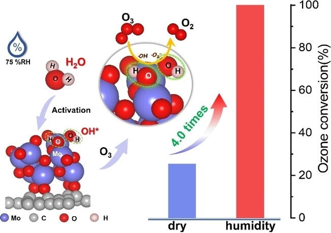 高濕度環境下臭氧在氧化鉬/石墨炔納米墻分解機制研究示意圖