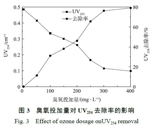 臭氧催化氧化實驗在室溫下進行,廢水初始 pH 為 5,反應時間為 60 min,通過調節臭氧進氣濃度控制臭氧的投加量,圖 2 和圖 3 為不同臭氧投加量條件下水中有機物的降解情況。由圖 2 可知,隨著臭氧投加量的增加,水中 COD 的去除率不斷升高,當臭氧投加量增 至 400 mg·L−1 時 , COD由 532 mg·L−1 降 至 246 mg·L−1, UV254 由 0.468降至 0.098,COD 和 UV254 的去除率分別升至53.7% 和 79.1%。COD 和 UV254 的去除率隨著臭氧投加量的增加而逐步升高,當臭氧投加量增到 300 mg·L−1 時,COD 和 UV254 的去除率開始趨于平緩,臭氧的利用率開始下降。臭氧催化氧化主要通過臭氧催化產生·OH,通過·OH 氧化水中有機物。隨著臭氧投加量的增加,有機物不斷被降解,隨著水中可被氧化的有機物的減少,·OH 與有機物發生碰撞的概率降低[17],從而導致臭氧的利用率下降。