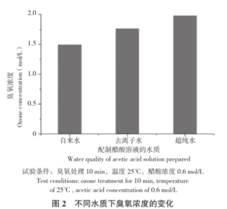 (2)分別用自來水、去離子水和超純水配制醋酸濃度為0.6 mol/L的醋酸溶液,在25℃條件下,通入臭氧處理10 min,取樣測定每個樣品中的臭氧濃度。