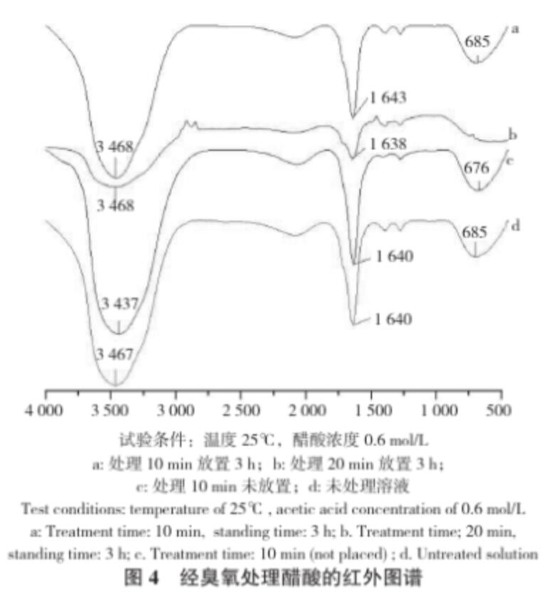 從圖3可以看出,在相同的試驗條件下,隨著放置時間的增加,醋酸溶液中的臭氧濃度急劇下降,當放置時間延長時,溶解的臭氧會有一部分揮發(fā)到空氣中,還有部分分解成氧氣,導致溶解度下降;在相同時間下,醋酸溶液中的臭氧濃度比去離子水中高,這表明臭氧在醋酸溶液溶液中比在水中更穩(wěn)定,加入少量醋酸利于臭氧貯存。從圖4可以看出,臭氧處理后放置3 h的醋酸有較為尖銳的吸收峰,其譜峰3 468 cm-1、3 437 cm-1、3 467 cm-1歸屬于O-H引起的伸縮振動,譜峰 1 643 cm-1、1 638 cm-1、1 640 cm-1歸屬于C=C引起的伸縮振動,譜峰685 cm-1、676 cm-1歸屬于C-O引起的伸縮振動。而臭氧剛處理完的醋酸以及未處理的醋酸的峰值不同,說明生成的O-H鍵和C-O導致吸收峰移動,從而造成它們的峰值有所偏移。