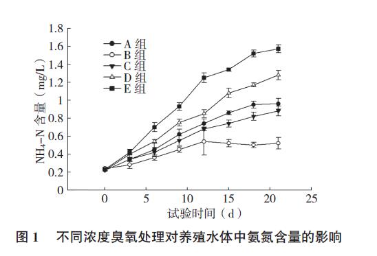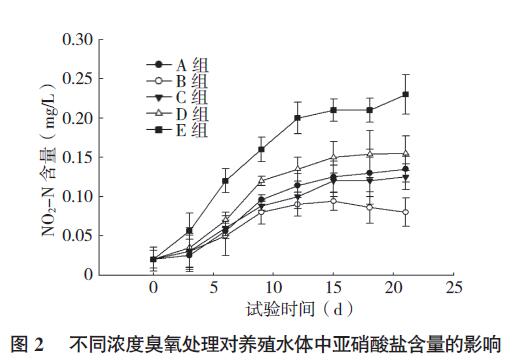 由圖1、圖2 可知,各組水體氨氮和亞硝酸鹽含量都呈上升趨勢(shì)。與對(duì)照組(E 組)相比,經(jīng)過(guò)臭氧處理水體中的氨氮和亞硝酸鹽含量上升緩慢,可見(jiàn)臭氧對(duì)水體中的氨氮和亞硝酸有明顯的降解效果。B 組(0.1 mg/L 臭氧)水體的氨氮和亞硝酸鹽含量顯著低于其他幾組,而A 組(0.05 mg/L 臭氧)水體的氨氮含量和亞硝酸鹽含量雖然與C 組(0.15 mg/L 臭氧)相比差異不顯著,但高于C 組??梢?jiàn),較低濃度臭氧對(duì)水體中氨氮和亞硝酸鹽降解效果不顯著,但其濃度也不是越高越好。