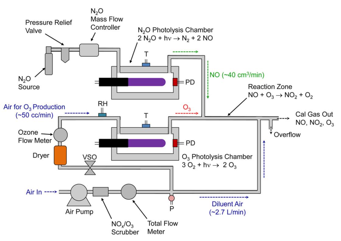 校準(zhǔn)濃度的 O 3是通過(guò)光解凈化的環(huán)境空氣中的氧氣產(chǎn)生的,校準(zhǔn)濃度的 NO 是通過(guò)使用一氧化二氮 (N 2 O )光解的技術(shù)產(chǎn)生的。