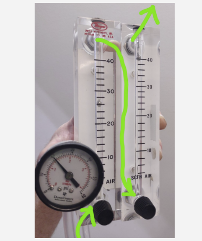 當(dāng)氣體,無論是空氣還是氧氣,通過流量計(jì)加壓時(shí),流量計(jì)將讀取不準(zhǔn)確的流量。下圖顯示了兩個(gè)相同的流量計(jì)并排,從氧氣濃縮器流過每個(gè)流量計(jì)的氧氣量相同。左邊的流量計(jì)壓力為20 psi,右邊的流量計(jì)壓力為0 psi。盡管流經(jīng)流量計(jì)的氧氣量是相同的,但流量讀數(shù)是不同的。在壓力下,流量計(jì)的讀數(shù)將低于實(shí)際流量。